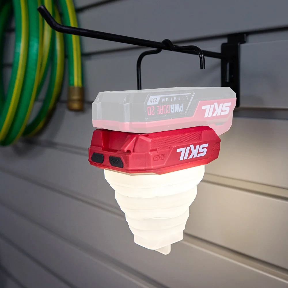 최대 300lm의 밝기로 360° 전방위 조명이 가능한 SKIL 12V/20V 멀티볼트 LED 접이식 캠핑 랜턴입니다.