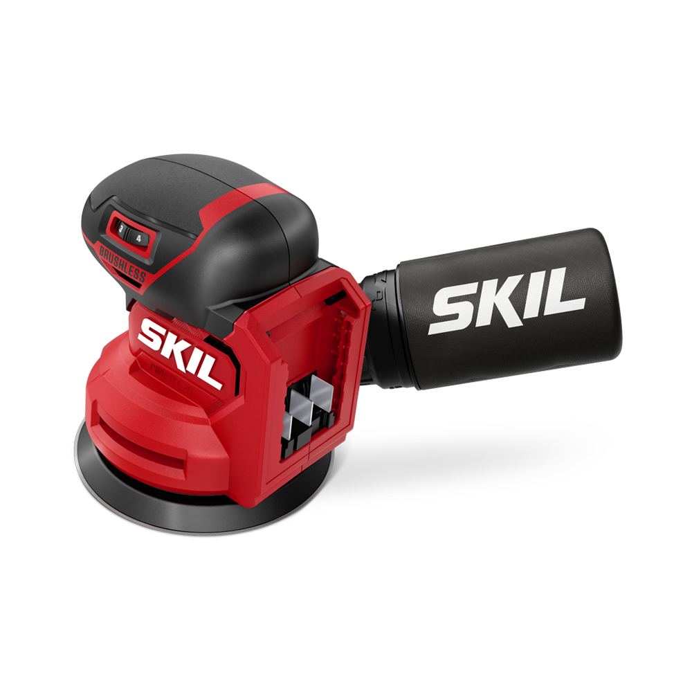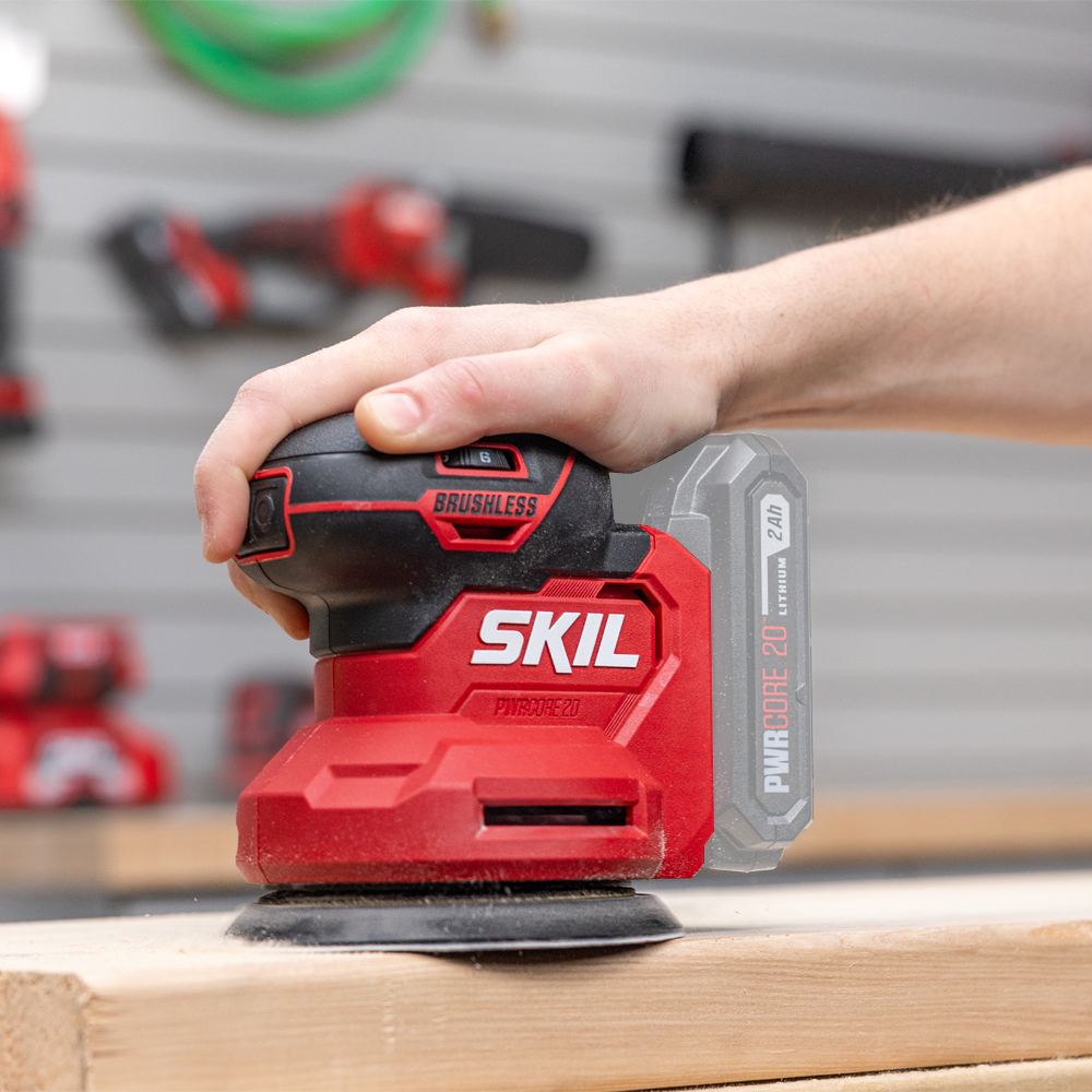 가구재 마감 등의 목공 작업의 마무리에 편안함을 제공하는 SKIL PWR CORE 20™ 브러시리스 20V 랜덤 오비탈 샌더입니다.
