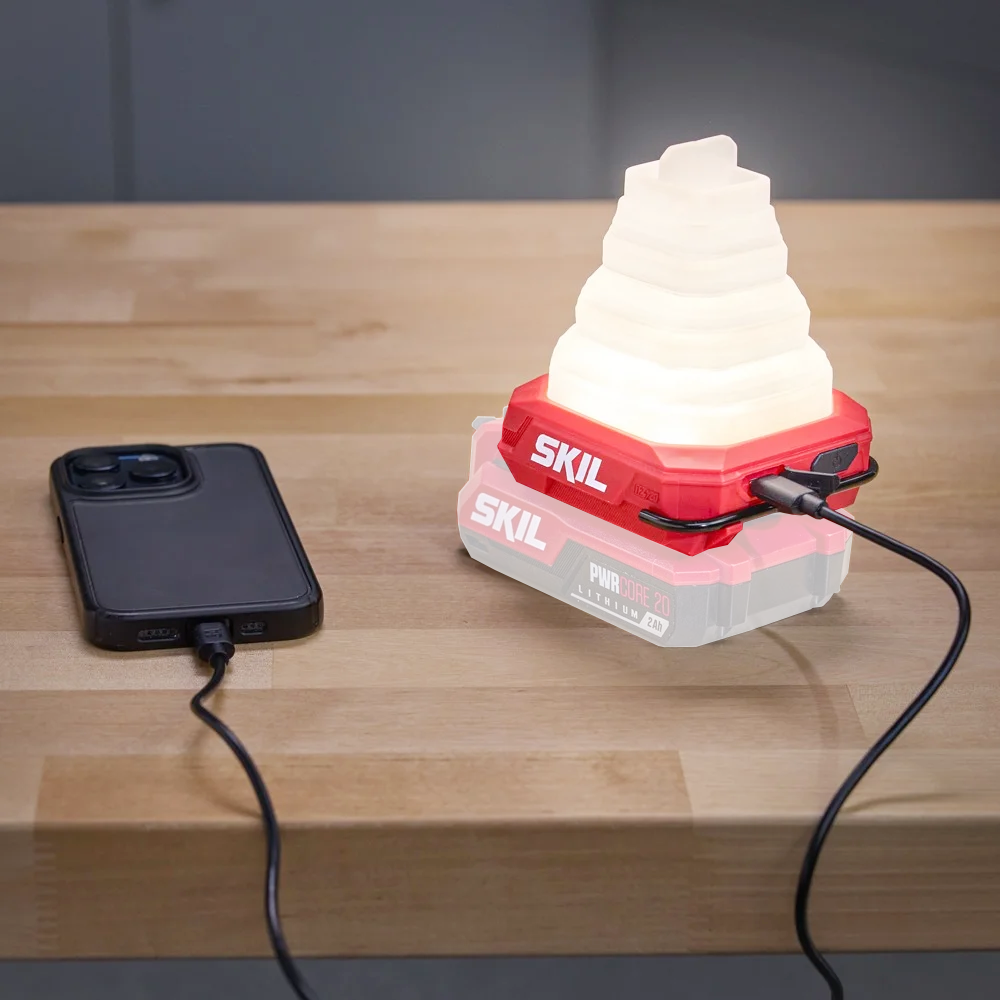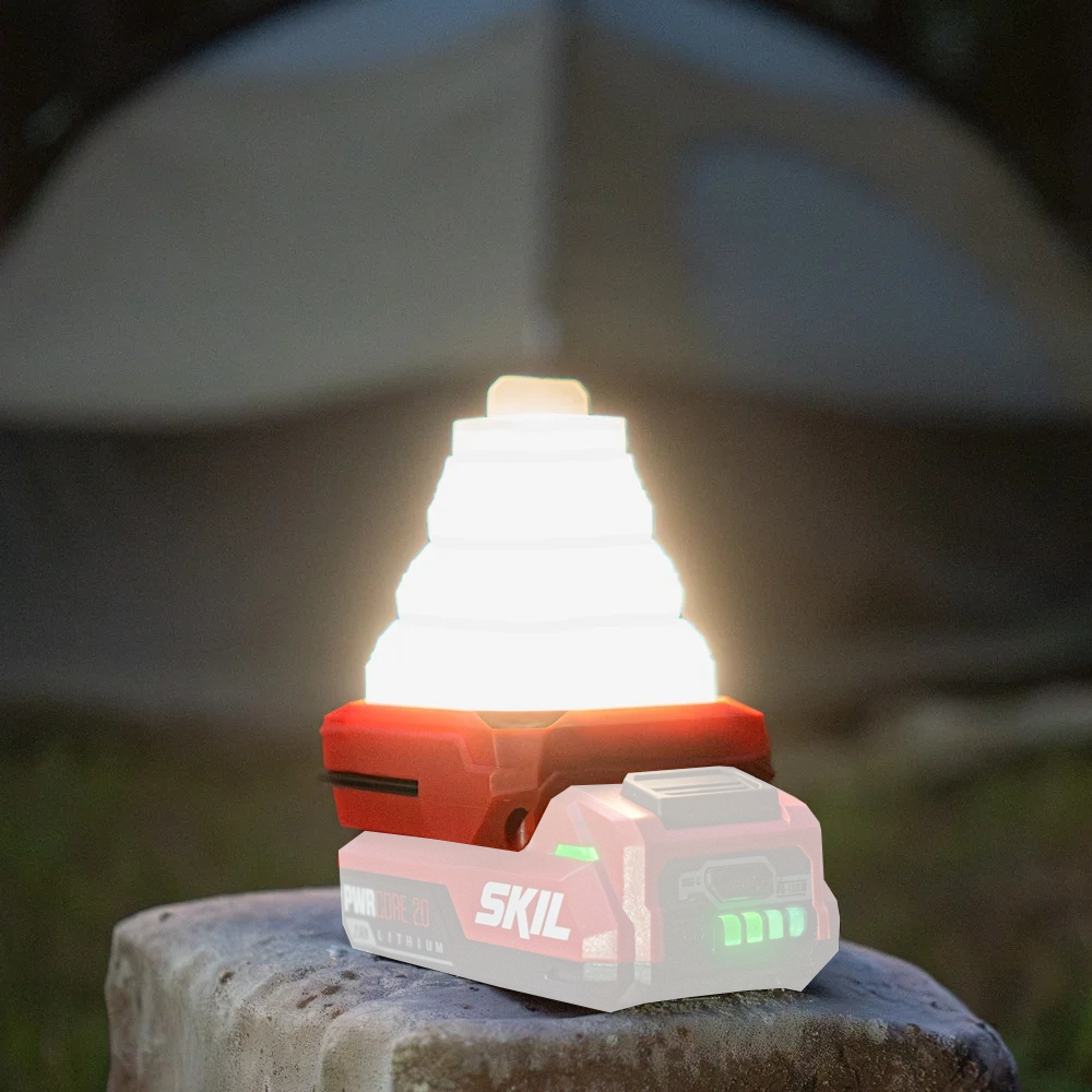 최대 300lm의 밝기로 360° 전방위 조명이 가능한 SKIL 12V/20V 멀티볼트 LED 접이식 캠핑 랜턴입니다.