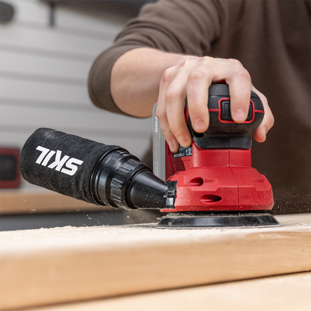 가구재 마감 등의 목공 작업의 마무리에 편안함을 제공하는 SKIL PWR CORE 20™ 브러시리스 20V 랜덤 오비탈 샌더입니다.